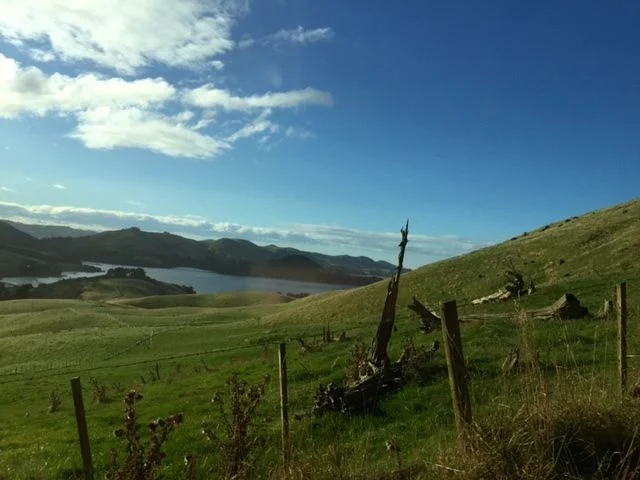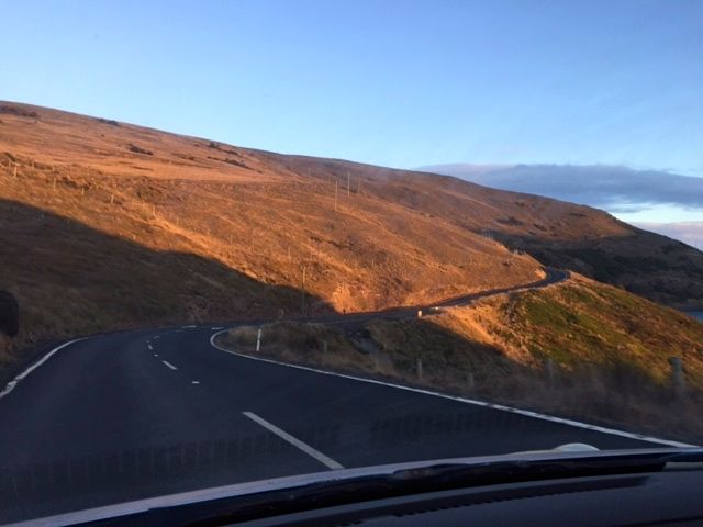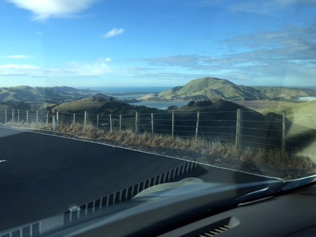 Today was the day that we were going to spend the afternoon driving out to the end of the nearby Otago Peninsula, a marvel of farmland on steeply graded hills running down to valleys and/or to the South Pacific Ocean.  Due to my extra-length legs, I was offered the front passenger seat in a borrowed (somewhat battered) small Nissan sedan henceforth to be known as the 'Vehicle Of Death'.  The front passenger seat, commonly referred to in lighter moments as "the suicide seat", has by far the best views so I took it willingly.  I did note an inoperable side-view mirror out my window, bent in and de-commissioned by a thick wad of wide scotch tape which faced it to the door.  In the States you can get a ticket for a non-functional mirror but New Zealand seems to (refreshingly) not-sweat-the-small-stuff so I didn't give it a second thought.