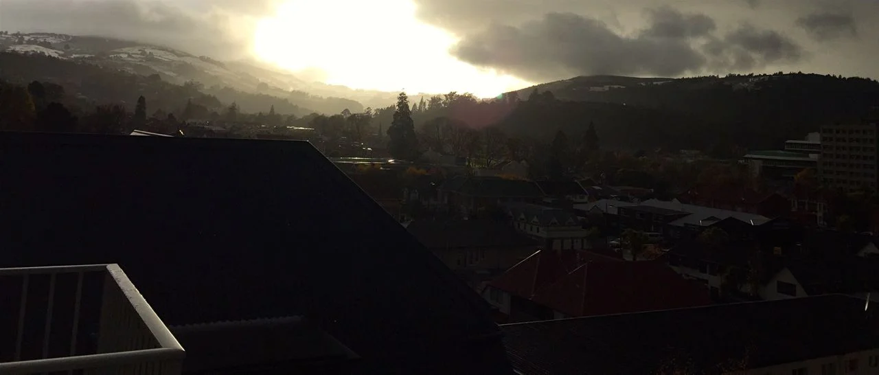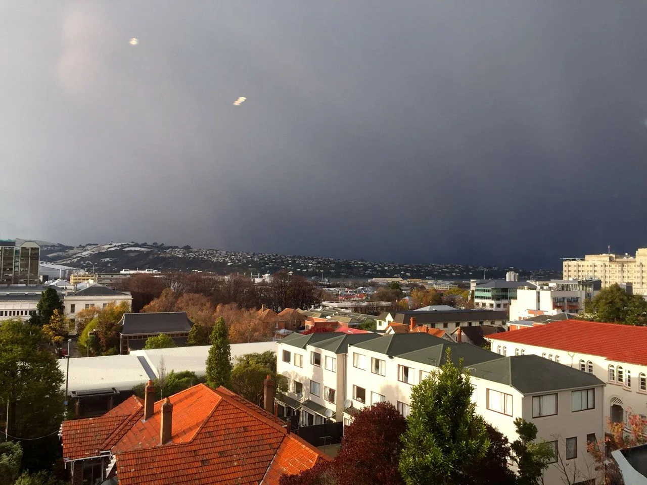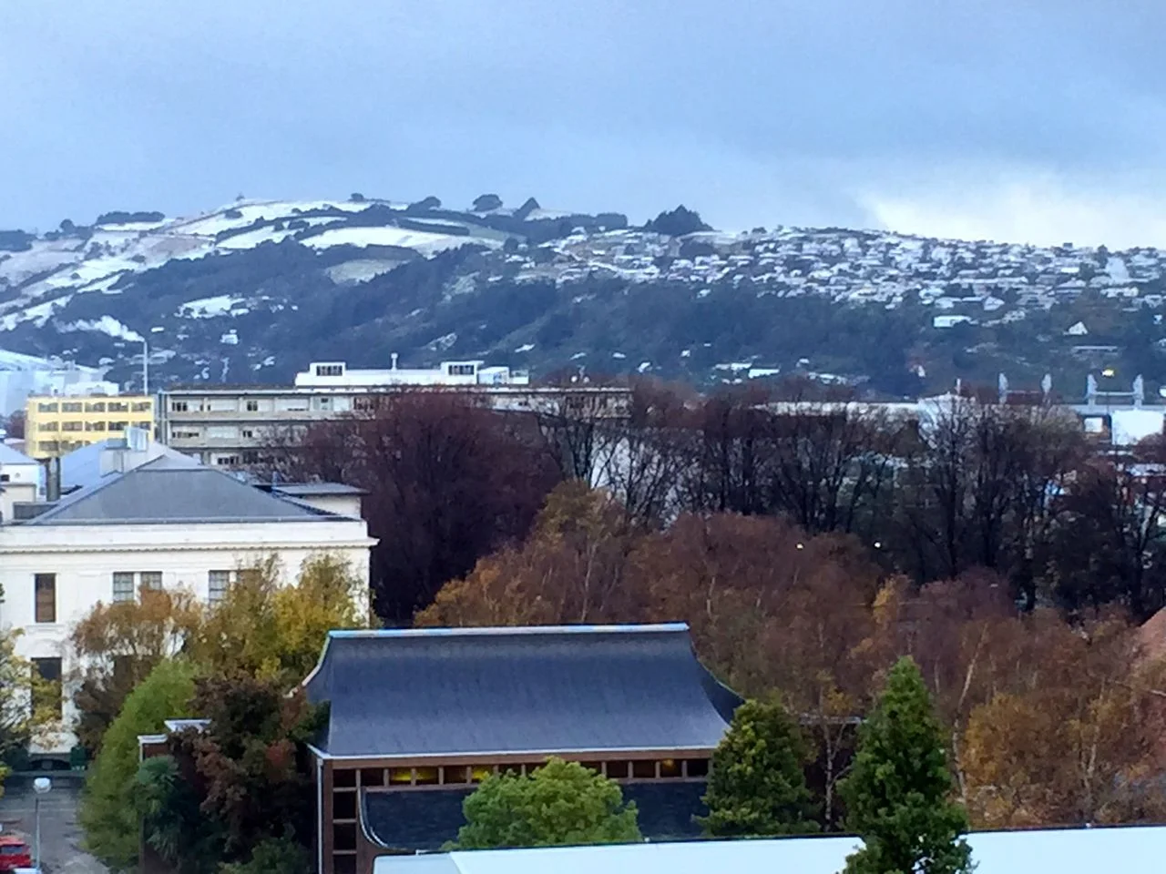 A loud clap and sustained crashing of thunder woke me at 5 AM but I managed to put off the inevitable til daybreak.  Then Mr. Green and I set off on foot through a wintry mix of snow, hail and icy rain to find some breakfast.  Even though New Zealand is literally one stop from Antartica, snow at sea level here in the south is surprisingly newsworthy.  Don't know if I'll ever get used to 'south' meaning 'colder than north'.