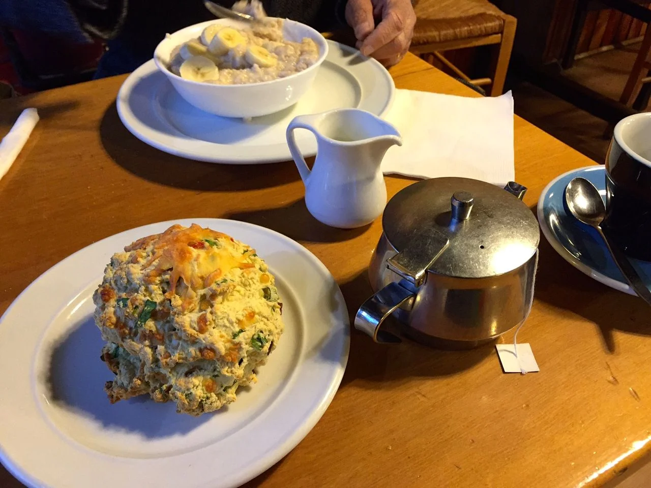 We dashed into a little place which serves oatmeal, Mr. Green's favorite (the locals call it porridge) and we proceeded to the counter and to the solidly built man standing behind it.  Wearing a t-shirt, tatoos and an apron, from his manner I'd say that he may have been a pirate in another life.  Visibly irritated with us for no good reason, it seems likely that he and his bad mood had a hand in baking this scone.