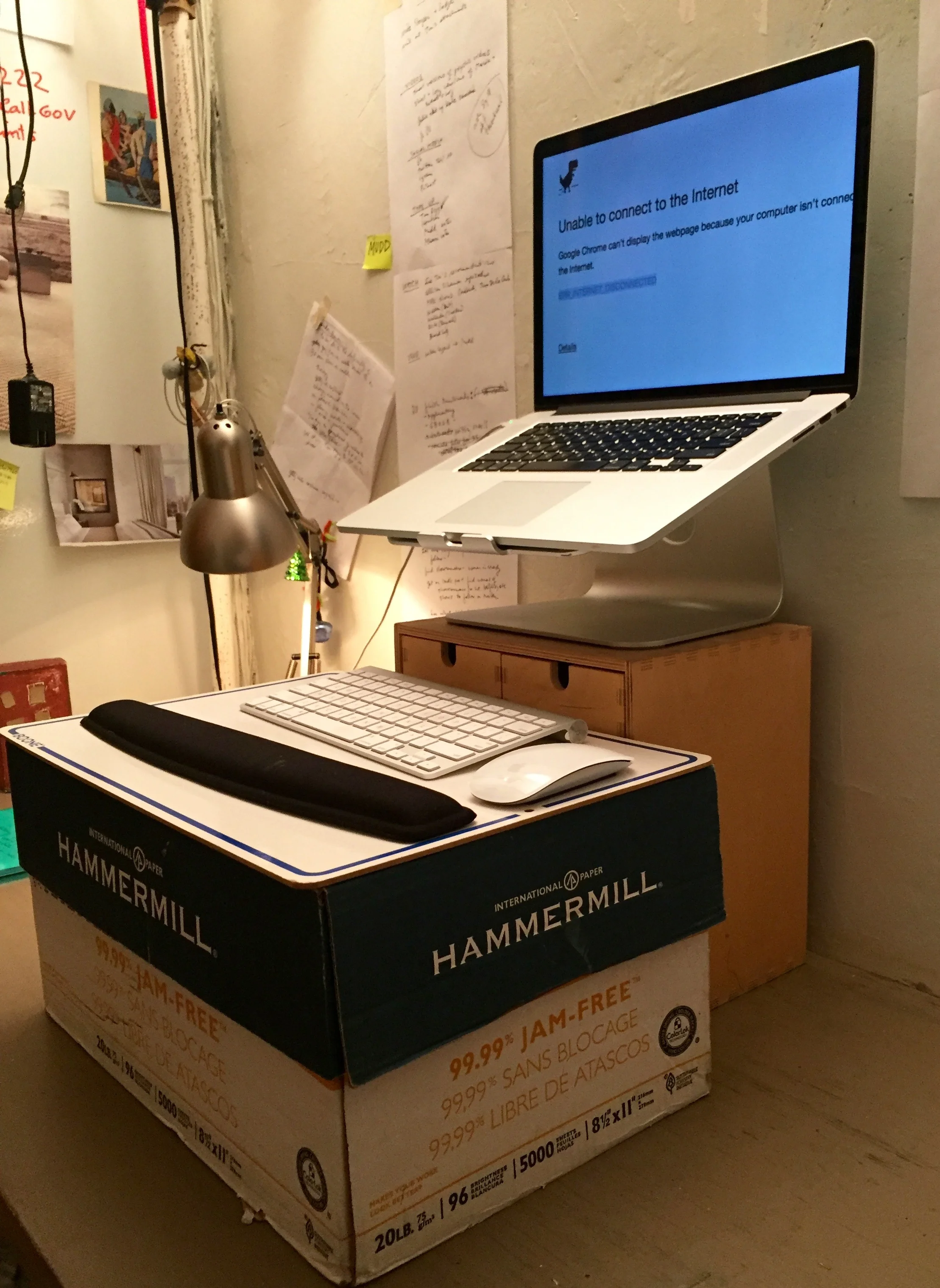 In honor of Cyber Monday, I thought I'd share in tedious detail the pride and joy of my cyber life: a scavenger-hunt-style standing desk.